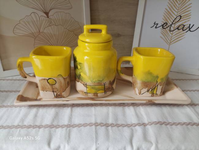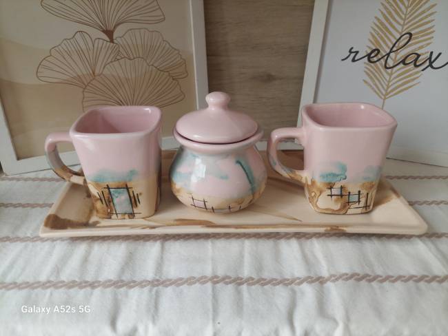 Juego café 2 Tazas Jarrito Cuadradas + Azucarera + Bandeja Rectangular