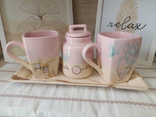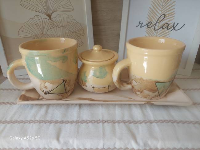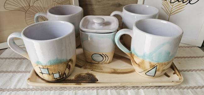 Set: 4 Tazas Rufina Grandes + Azucarera + Bandeja Grande